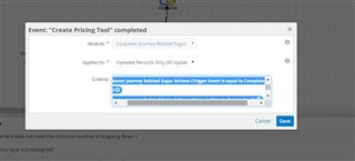 I'm trying to put together a SugarBPM process that will do this, as shown in "sugarBPM screenshot". The process starts when the "trigger event" is "Complete" in Customer Journey Related Sugar Actions module and when "name" in Customer Journey Related Sugar Actions module is "Create Pricing Tool" (start event settings screenshot). After this, I've set up a Form Response Evaluation. Then, I got stuck. I'm having trouble figuring out how to set the actions in Approve and Reject pathways so that the process works as described above. Any help would be appreciated.