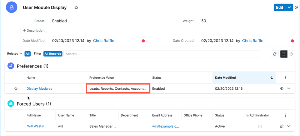The above preference enforce sets the order of the displayed modules, so that when Will logs in, he sees the modules that matter most to his day-to-day job: