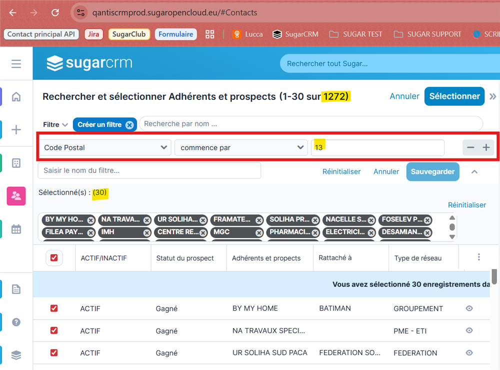 Step 2 :I tried to select all accounts where the "Postal Code" starts with '13'. However, the list view only allows me to select 20 accounts at a time, but my filter returns 1272 accounts.