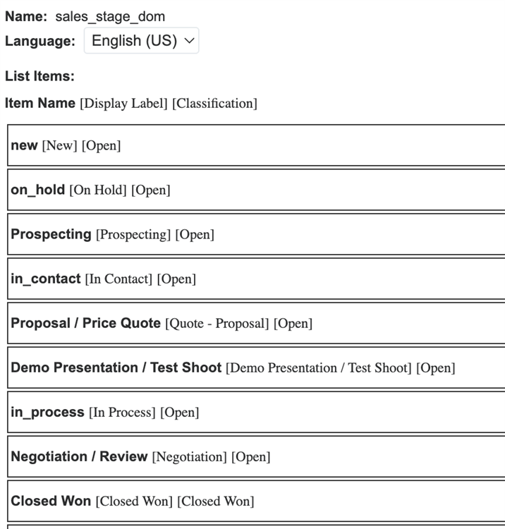 createList("new","on_hold","Prospecting","in_contact","Proposal / Price Quote","Demo Presentation / Test Shoot","in_process","Negotiation / Review"))