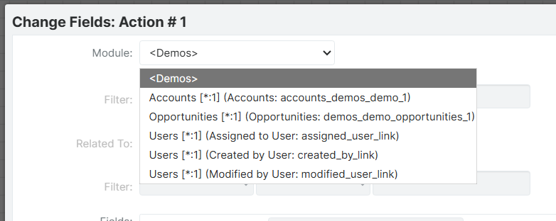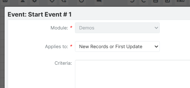 I'm running sugar enterprise 14.0.3 on-site. The Target Module on my BPM process is Demos, and I can add the criteria on the start settings. I just can't get the action type to work.