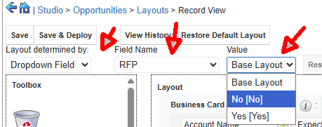 This method requires the "RFP Flag" to be a Dropdown (e.g., values "Yes"/"No") rather than a Checkbox, as Studio does not support layout switching based on checkboxes.