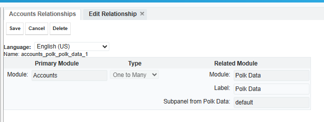 I created a custom module within my sandbox -- i added a relationship Accounts 1 to Many to Polk Module (new custom module). Subpanel from Polk Data is default only - no other options