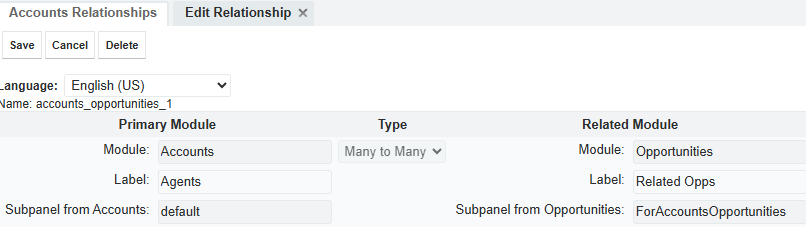 I've created a new many-to-many relationship between Opportunities and Accounts.  The subpanel on the Opportunity module shows up as expected "Agents"; however, on the Account side the related subpanel "Related Opps" appears, but there is no way to edit which fields show.
