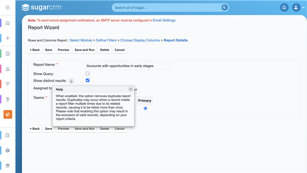 Exclude duplicate report results with the new "Show distinct results" checkbox in Rows and Columns reports